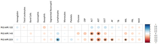 Pearson’s correlation for miRNA expression analysis (fold change) and the hematological and biochemical markers analyzed in the study. The heat map indicates a negative correlation with red circles; the higher the level of fold change (RQ), the lower the values of the hematological markers. The positive correlation is shown in blue circles. CRP: C-reactive protein; ALT: alanine aminotransferase; AST: aspartate aminotransferase; GGT: gamma-glutamyl transferase; AF: alkaline phosphatase; BT: total bilirubin; NRL: neutrophil lymphocyte ratio; PLR: platelet lymphocyte ratio; MLR: monocyte platelet ratio.