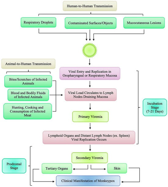 The transmission patterns of mpox have evolved significantly, particularly with the resurgence of the virus in recent years. Mpox was primarily recognized as a zoonotic disease transmitted from animal reservoirs to humans []. The primary animal reservoirs for mpox are believed to be small mammals, particularly rodents, which serve as a natural host for the virus []. In Central and West Africa, where the disease is endemic, humans are often exposed to the virus through direct contact with infected animals, either through hunting, handling, or consuming bushmeat []. Studies have identified several species, including African squirrels, Gambian pouched rats, and dormice, as potential reservoirs. These animals harbor the virus and can transmit it to humans through bites, scratches, or direct contact with bodily fluids or lesions []. Zoonotic transmission of mpox usually occurs in rural areas with more frequent human–wildlife interactions []. The virus can also be transmitted through contact with contaminated materials, such as bedding or clothing, that have been in contact with an infected animal []. This transmission has been the primary driver of mpox cases in endemic regions, with sporadic outbreaks occurring when humans come into close contact with wildlife or when there is a spillover event from animals to humans []. Despite these risks, human-to-human transmission was historically considered less efficient, with transmission occurring mainly through direct contact with infected animals rather than between humans [].