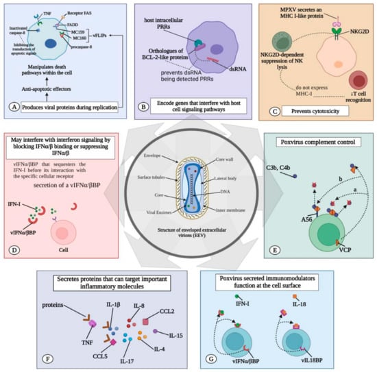 Visual representation of MPXV strategies to evade the host immune response, highlighting viral proteins inhibiting key immune signaling pathways like cytokine neutralization and interferon/complement inhibition. The diagram illustrates how these mechanisms contribute to establishing a productive infection and causing disease. (A) The virus enters the host cell; (B) the virus uncoats and releases its core into the cytoplasm; (C) the virus begins replicating its DNA and producing viral proteins; (D) some viral proteins are secreted from the infected cell; (E) secreted viral proteins bind to and inhibit host cytokines, disrupting immune signaling; (F) other viral proteins remain within the infected cell; and (G) intracellular viral proteins inhibit host cell processes, such as apoptosis and interferon responses, further evading the immune system. (Figure from Ref. []).