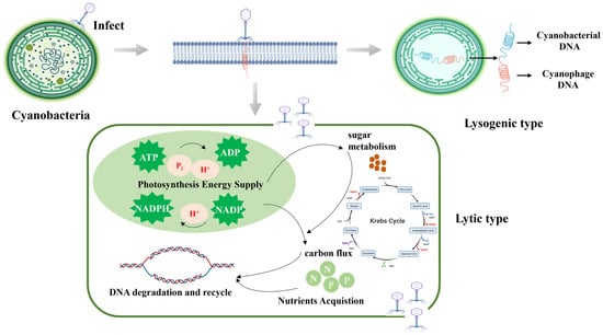 These phages utilize two main infection strategies known as lytic and lysogenic, and their infection mechanisms have been elucidated (Figure 2). When phages infect cyanobacteria, they inject their nucleic acid into the host cell. The injected nucleic acid then utilizes the resources of the host to replicate and assemble capsid proteins, leading to alterations in various biological processes within the host. These changes involve photosynthesis, sugar metabolism, carbon metabolism, DNA synthesis and repair, and nutrient acquisition.