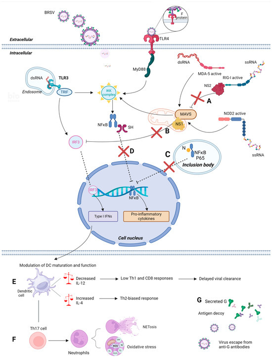 Schematic representation of some of the respiratory syncytial virus’s immune-evading mechanisms. (A) NS2 interacts with the CARD domain of RIG-I; (B) NS1 binds to MAVS, the adaptor protein used by the RIG-I receptor on the signaling pathway. These interventions inhibit IRF3 activation, preventing downstream pathway events and hindering type I IFN production. (C) N protein is involved in sequestering the P65 subunit of NFκB into intracytoplasmic inclusion bodies, leading to decreased translocation to the nucleus; (D) The SH protein interferes with pro-inflammatory cytokines’ production through the NFκB pathway. (E) Interference with IRF3 and NFκB pathways modulates the function of DCs and may suppress their maturation, resulting in decreased IL-12, which is essential for CD8 T-cell differentiation and viral clearance, and increased IL-4, leading to poorly protective and potentially detrimental Th2-biased responses. (F) BRSV infection may induce Th17 differentiation, contributing to neutrophil accumulation, NETosis, and oxidative stress, which are thought to enhance pathology. (G) BRSV-secreted G protein (sG) acts as a decoy antigen, sequestering antibodies away from the actual virion. Abbreviations: BRSV = bovine respiratory syncytial virus; dsRNA = double-stranded RNA; ssRNA = single-stranded RNA; TLR-3 and TLR-4 = toll-like receptor 3 and 4; TRIF = toll interleukin 1 receptor (TIR)-domain-containing adaptor protein inducing interferon-beta; IRF3 = interferon regulatory factor 3; NFκB = nuclear factor kappa-light-chain-enhancer of activated B-cells; IL-4 and IL-12 = interleukin 4 and 12 F protein = fusion protein; SH = small hydrophobic protein; NS1 and 2 = nonstructural proteins 1 and 2; G = major attachment glycoprotein; N = nucleoprotein; MyD88 = myeloid differentiation primary-response 88; MAVS = mitochondrial antiviral-signaling protein; NOD2 = nucleotide oligomerization domain 2; RIG-I = retinoic acid-inducible gene I; MDA-5 = melanoma differentiation-associated protein 5; Th1, Th2 and Th17 = T helper cells 1, 2 and 17; IFNs = interferons. Figure created using BioRender (BioRender.com/e06u568).