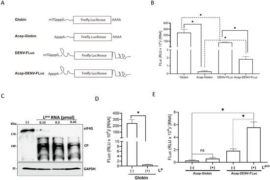 Next, we evaluated the impact of directly inhibiting cap-dependent translation on the monocistronic mRNAs. For this, different amounts of in vitro synthesized Lpro encoding mRNA (0.15, 0.3, or 0.45 pmol) were transfected in BHK-21 cells. The cleavage of eIF4G by the Lpro leads to the inhibition of cap-dependent (eIF4E-dependent) but not cap-independent translation initiation [36,37]. The expression of the Lpro was indirectly assessed by monitoring the cleavage of eIF4G by Western blot (Figure 1C). Next, BHK-21 cells were transfected with Globin mRNA, Acap-Globin, and Acap-DENV-FLuc, with or without the Lpro mRNA (0.15 pmol). In the presence of the Lpro, cap-dependent translation initiation from the Globin mRNA was abrogated (Figure 1D). As anticipated, FLuc activity of the Acap-Globin mRNA was low, confirming the lack of translation from this control RNA. The presence of the Lpro translation from the Acap-DENV-FLuc mRNA was significantly increased (by 311%) in BHK-21 cells (Figure 1E). These results show that the expression of Lpro hinders cap-dependent while enhancing DENV cap-independent translation initiation in BHK-21 cells.