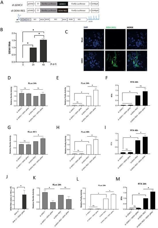DENV IRES activity in BHK-21 cells expressing the DENV gRNA. (A) Schematic representation of the dual-luciferase (dl) plasmids and DENV RNA used in the studies. In these dl-plasmids, the first cistron corresponds to the Renilla luciferase (RLuc) ORF, while the second cistron corresponds to the FLuc ORF. The dl ∆EMCV that harbors in the intercistronic region a defective encephalomyocarditis virus (∆EMCV) 5′UTR that lacks IRES activity has been previously described [16]. The dl DENV IRES harbors the 5′UTR (nts 1-96; GeneBank U87411) of the DENV 2 (strain 16681) mRNA within the intercistronic region, previously described as DENV IRES [7]. (B) dl-vectors indicated were transfected in BHK-21 cells, and at 4 h.p.t., the culture medium was replaced and cells were transfected, or not, with DENV gRNA (1X). DENV RNA in cells was monitored at times 0, 24, and 48 h.p.t. Statistical analysis was performed using one-way ANOVA, followed by Tukey’s multiple comparison test (* p < 0.05, and ns, not significant). (C) At 48 h.p.t. of the DENV gRNA, the expression of the viral NS3 protein was detected by immunofluorescence (IF) using a commercially available anti-DENV NS3 antibody. Vectashield with DAPI was used as a mounting media. Images were captured and analyzed by confocal laser microscopy (Nikon C2+, Melville, NY, USA) and processed by Image J. Scale bar = 10 μm. (D–I) RLuc and FLuc activities were determined at 24 (D–F) and 48 (G–I) h.p.t. of the DENV gRNA. RLuc (D,G) and FLuc (E,H) activities expressed relative to those obtained in cells transfected with the dl DENV IRES plasmid alone arbitrarily set to 1. Results are also expressed as relative translation activity (RTA) relative to the dl DENV IRES activity (F,I), which was set to 1. (J–M) dl-vectors indicated were transfected in BHK-21 cells, and at 4 h.p.t., the culture medium was replaced and cells were transfected, or not, with DENV gRNA (5X). (J) DENV RNA in cells was monitored at times 0 and 24. Statistical analysis was performed using one-way ANOVA, followed by Tukey’s multiple comparison test (* p < 0.05, and ns, not significant). (K–M) RLuc and FLuc activities were determined at 24 h.p.t. of the DENV gRNA. RLuc (K) and FLuc (L) activities expressed relative to those obtained in cells transfected with the dl DENV IRES plasmid alone arbitrarily set to 1. (M) Results are also expressed as relative translation activity (RTA) relative to the dl DENV IRES activity, which was set to 1. Values are the mean (+/− SEM) for at least three independent experiments, each performed in duplicate. RTA corresponds to the FLuc/RLuc ratio that is used as an index of IRES activity. Statistical analyses were performed using one-way ANOVA and Tukey’s multiple comparison test (* p < 0.05, and ns, not significant).