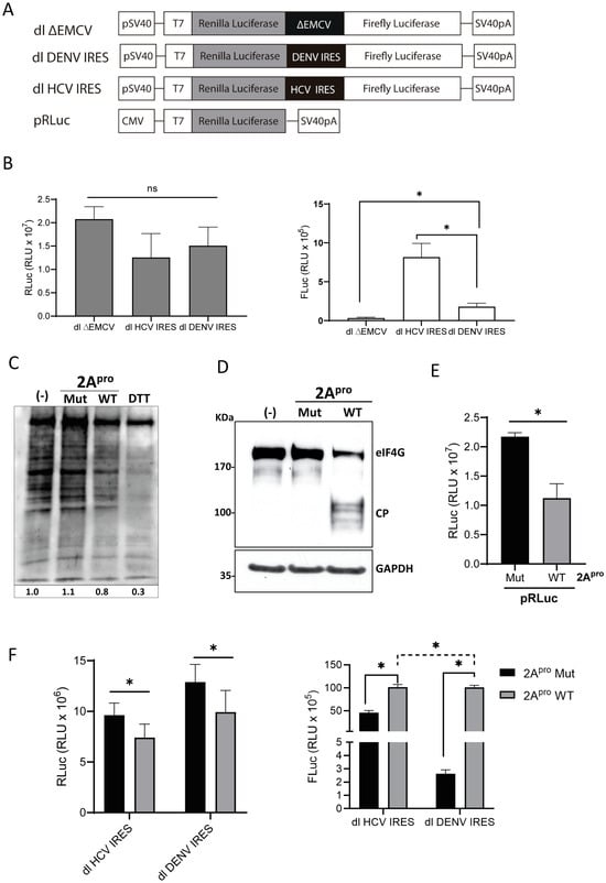 DENV IRES activity is stimulated in BHK-21 cells expressing the HRV 2A protease. (A) Schematic representation of the vectors used in the assay. (B) BHK-21 cells were transfected with the dl ∆EMCV, dl HCV IRES, or dl DENV IRES plasmids (200 ng). The activities of the RLuc (gray bars) and FLuc (white bars) were determined and expressed as RLU. (C–F) Plasmids pRLuc, dl HCV IRES, or dl 5′UTR DENV (200 ng) were transfected in BHK-21 cells together with a plasmid expressing the wild-type HRV-2A protease (p2A-WT) or an inactive mutant (p2A-Mut) (500 ng). (C) The impact of HRV p2A-WT or an inactive mutant (HRV p2A-Mut) on global protein synthesis was monitored by a SUnSET experiment [33,34]. The relative amount of puromycin-labeled protein was estimated by image-J. (D) The cleavage of eIF4G was monitored by Western blotting using polyclonal antibodies against eIF4G [35]. (E) RLuc activity of the pRLUc in the presence of HRV-p2A WT or HRV-p2A Mut was determined and expressed as RLU. (F) RLuc and FLuc activities from the dl-plasmids were measured and expressed as RLU. Statistical Analysis was performed using a t-test for RLuc analysis and a one-way ANOVA followed by a Tukey’s multiple comparison test for Fluc comparisons. Values represent the mean (±SEM) for three independent experiments, each conducted in duplicate (* p < 0.05, and ns, not significant).