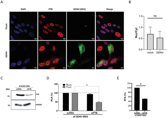 Endogenous PTB localization in BHK-21 cells and impact of PTB knockdown on DENV IRES activity. (A) BHK-21 cells were infected with DENV2 NGC or not (Mock). At 48 h.p.i., PTB and DENV were detected using an anti-PTB antibody or anti-DENV NS3 antibody, respectively. Vectashield with DAPI was used as a mounting medium. Images were captured and analyzed by confocal laser microscopy (Nikon C2+, Melville, NY, USA) and processed by Image J. Scale bar = 10 μm. (B) PTB’s nuclear and cytoplasmic distribution in DENV-infected (NS3 positive; DENV) and non-infected (mock) cells was roughly estimated by determining the ratio between nuclear and cytoplasmic mean fluorescence intensity (MFI). The values shown were obtained from three full images captured and analyzed by confocal laser microscopy, including the one used to extract panel (A). Statistical analysis was performed using a t-test (* p < 0.05). (C–E) BHK-21 cells were transfected with a scrambled RNA (sc) or siRNA designed to target PTB RNA (PTB isoforms and paralogs) and the dl DENV IRES plasmid. (C) Knockdown of PTB 24 h.p.t. was confirmed by Western blotting using an anti-PTB antibody. GAPDH was detected using an anti-GAPDH antibody (αGAPDH) as a loading control. (D,E) RLuc and FLuc activities were measured 24 h.p.t. and expressed relative to the scRNA set to 100% as RLA (D) or RTA (E). The values shown are the mean (+/− SEM) of three independent experiments, each conducted in duplicate. Statistical analysis was performed using a t-test (* p < 0.05).