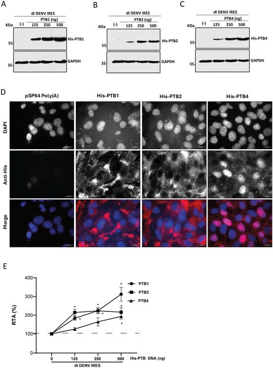 Due to alternative splicing, three isoforms of PTB (PTB1, PTB2, and PTB4) are generated in cells [50]. Interestingly, the different PTB isoforms impact mRNA splicing and translation differentially [17,25,59]. Given that PTB knockdown negatively impacted DENV IRES activity (Figure 4), we explored whether PTB1, PTB2, and PTB4 played a role in DENV IRES-mediated translation initiation. Thus, BHK-21 cells were transfected with dl DENV IRES vector and plasmids encoding for His-PTB1, His-PTB2, His-PTB4, or the control DNA pSP64 Poly(A). At twenty-four h.p.t., protein lysates were obtained, and the overexpression of His-PTB1 (Figure 5A), His-PTB2 (Figure 5B), or His-PTB4 (Figure 5C) was confirmed by Western blotting using an anti-His antibody and detecting GAPDH as a loading control. Subcellular localization of the overexpressed His-PTB isoforms in cells was followed in a parallel experiment by an IF assay (Figure 5D). Overexpressed His-PTBs were identified in the cell’s nucleus and cytoplasm. However, for His-PTB4, a more nuclear signal was evident (Figure 5D). Luciferase activities were measured, and data were expressed as RTA, with the values from cells transfected with the dl DENV IRES plasmid and the control DNA (-) set to 100% (Figure 5E). The overexpression of His-PTB1, His-PTB2, and His-PTB4 stimulates DENV IRES activity. However, the stimulation of DENV IRES activity was not equivalent for the three PTB isoforms (Figure 5E). The stimulation hierarchy for the DENV IRES was PTB1 (200%) > PTB2 (100%) > PTB4 (93%).