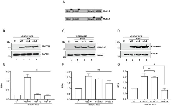 Next, we evaluated the impact of PTBmut1.2 and PTBmut3.4 on DENV IRES activity. For this, the dl DENV IRES plasmid was cotransfected in BHK-21 cells with a control DNA (-), with His-PTB1, His-PTB1mut 1.2, His-PTB1mut3.4, PTB2-FLAG, PTB2mut 1.2-FLAG, PTB2mut3.4-FLAG, PTB4-FLAG, PTB4mut 1.2-FLAG, or the PTB4mut3.4-FLAG. The presence of the recombinant proteins in transfected BHK-21 cells was confirmed by Western blotting using an anti-His antibody for PTB1 (Figure 6B) or an anti-FLAG antibody for PTB2 (Figure 6C) and PTB4 (Figure 6D). The expression of His-PTB1 (Figure 6E) stimulated DENV IRES activity to a greater extent than PTB2-FLAG or PTB4-FLAG (Figure 6F,G). Stimulation of DENV IRES activity by PTB2-FLAG and PTB4-FLAG was similar. Inactivation of either RRM1/RRM2 or RRM3/RRM4 abrogated stimulation of the activity of the DENV IRES by His-PTB1 (Figure 6E). The inactivation of RRM1/RRM2 or RRM3/RRM4 in the context of PTB2-FLAG had no impact on the ability of the protein to stimulate the DENV IRES (Figure 6F). In PTB4-FLAG, mutant RRM3/RRM4, but not RRM1/RRM2, abrogated the stimulation of DENV IRES activity (Figure 6G). Thus, the results show that in the case of PTB1, both domains RRM1/RRM2 and RRM3/RRM4 are necessary to stimulate DENV IRES activity (Figure 6E), whereas, for PTB4, only RRM1/RRM2 is sufficient to enhance IRES activity (Figure 6G). In the case of PTB2, only one RRM pair is necessary to ensure the stimulation of the DENV IRES (Figure 6F). Together, the results suggest that PTB ITAF function is associated with its ability to bind RNA.