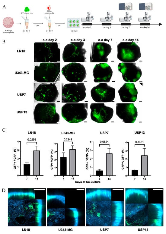 Co-culture of brain organoids and CNS tumor cell lines. (A) Schematic representation of co-culture assay and analyses timeline. (B) Brightfield-fluorescence images of co-cultured brain organoids and GFP+ LN18 GBM, U343-MG GBM, USP7 ATRT and USP13 MED cell lines (scale bar 200 µm) (c-c: co-culture). (C) Flow cytometry quantification of GFP+/GFP− (tumor/non-tumor) cell proportion (%) in co-cultured groups, n = 3. (D) Orthogonal view images from c-c day 14 whole co-cultured organoids (scale bar 100 µm).