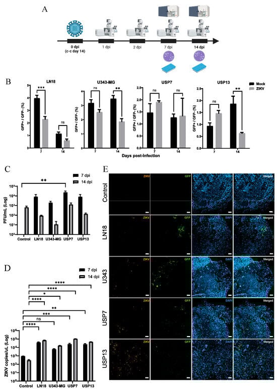 To investigate ZIKV infection and replication in hybrid and control organoids, infectious viral particle quantification and RNA copies concentrations were assessed through plaque-forming units (PFU) and RT-qPCR assays, respectively. Culture supernatants were collected in triplicates and analyzed at 7 and 14 dpi (Figure 2A). In the tumor-free control groups, viral particles were only detected at 14 dpi (Figure 2C). In contrast, infectious viral particles were present in the supernatants of all infected co-cultured tumor cell lines, both at 7 and 14 dpi, and the concentrations were higher one week post-infection in all hybrid groups in comparison with control organoids (Figure 2C). Interestingly, USP7 presented the highest infectious viral load at both timepoints, being significantly higher than the control group at 7 dpi.