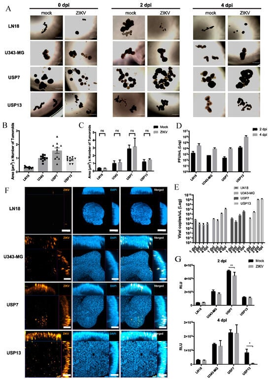 ZIKV infection effects on three-dimensional CNS tumoroids. (A) Brightfield images of tumoroids at 0, 2 and 4 dpi (scale bar 1000 µm). (B,C) Measurement of area (µm2) multiplied by the number of formed tumoroids (B) at 7 days (0 dpi) after plating and (C) at 4 dpi (ns: non-significant). (D) Supernatants PFU/mL concentration of ZIKV-treated tumoroids at 2 and 4 dpi. (E) the RT-qPCR viral RNA quantification of ZIKV-treated tumoroids supernatant at 2 and 4 dpi. (F) Orthogonal view images of whole tumoroids immunolabeled for ZIKV protein NS2B (orange) at 4 dpi (scale bar 50 µm). (G) Luminescence assay for tumoroids cell viability, where RLU measurement is proportional to live cell number, at 2 (above) and 4 dpi (below). * p < 0.05. ** p < 0.01.