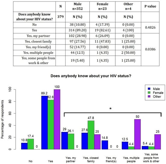 We then compared the participants’ responses with regard to their gender in Figure 1. In general, women were slightly more prone than men not to tell anyone about their infection (17.39% of women vs. 10.8% of men, p = 0.4826), although there is a substantial difference in the size of both groups (352 men and 23 women). In terms of the specific groups with whom our patients decided to share their HIV status, there were statistically significant differences between the sexes (p = 0.0386). Women shared the information with family more often than other groups, while men were the only group to share their HIV status exclusively with friends and also the only one to disclose the information to people from work (depicted collectively with ‘other’).