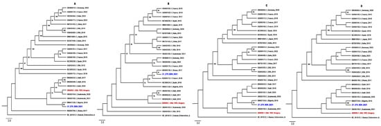 Multiple alignments were performed using our dataset, including the newly characterized sequences and previous sequences of the capsid protein, the VP1 protein, complete E11 genomes and one outgroup retrieved from GenBank (https://www.ncbi.nlm.nih.gov/genbank, accessed on 26 February 2024), with the ClustalW method implemented in the BioEdit software (version 7.2.5) [34]. The maximum likelihood (ML) phylogenetic tree was inferred using IQ-TREE (version 1.6.12), with the GTR+F+G4 model as the best-fitted nucleotide (nt) substitution model for our dataset, and the branch support was calculated using ultra-fast bootstrapping with 1000 replications [35]. The ML tree topology was visualized with FigTree (version 1.4.4) [36] and the nodes were supported by bootstrap values.
