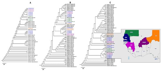 All the newly characterized E11 nucleotide sequences aligned, revealing a high identity at the nucleotide level. Moreover, the phylogenetic ML tree inferences based on the entire coding region of the capsid protein (Figure 2A) and VP1 (Figure 2B) and partial VP1 (Figure 2C) sequences confirmed the data from the BLAST and RIVM and revealed that the E11 sequences were closely related to previous strains, mainly from Africa, and had nucleotide homology ranging from 80 to 100%. Interestingly, our data showed a monophyletic sub-regional clustering of E11 genotype in Africa, which is distinct from the strains that were recently associated with sepsis in Europe (Figure 2).