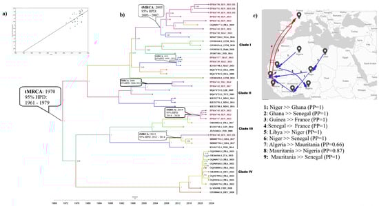 Subsequently, clade I, including the newly characterized Senegalese sequences, has experienced two introductions to Senegal; one from Ghana through Niger in 2013 (95% HPD, 2012–2014) and another from France through Guinea in 2019 (95% HPD 2018–2020). Clade II, grouping Senegalese and Nigerian strains, originated from Libya in 2009 (95% HPD, 2006–2012) while clade III, including Mauritanian strains, spread from Algeria in 2011 (95% HPD, 2009–2013). In addition, the virus spread from Senegal in 2005 (95% HPD, 2003–2007) and was successively introduced to Mauritania and France. Clade IV seems to be restricted to Europe (Figure 3).