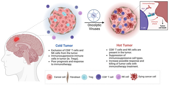 OV-mediated cold tumor transformation into hot tumor exhibits immunological features that may enhance the response to immunotherapeutic agents against glioblastoma. Created in BioRender. [Laboratory, M. (2024) BioRender.com/m60l030 (accessed on 28 October 2024).]