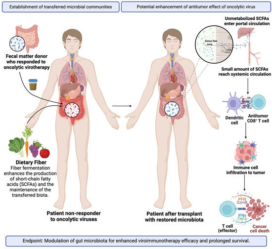 Restoration of the gut microbiota of a non-responsive patient to oncolytic viral therapy from an FMT of a responder donor with an adjuvant diet to improve the establishment of gut commensals and SCFA production. Special emphasis on the antitumoral effects of the restored microbiota on the oncolytic virus. Created in BioRender. Laboratory, M. (2024) BioRender.com/q49i287 (accessed on 28 October 2024).