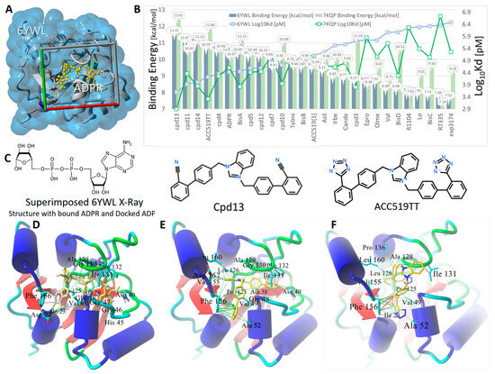 Docking of experimental sartans (e.g., ACC519TT, Cpd13, BisA, etc.), FDA-approved sartans (e.g., candesartan, olmesartan, losartan, etc.), and known inhibitors (e.g., R1104 and R7335) of the SARS-CoV-2 NSP3 Mac1 domain. (A) Overview of the docking setup showing the X-ray crystallographic structure for the SARS-CoV-2 Mac1 domain, PDB 6YWL, rendered as gray ribbons, and the water-accessible surface (blue shading) with its bound native ligand, ADPR (yellow atoms as spheres). The docking region of interest in which energy grids were constructed is indicated by the walled “periodic” box with colored lines of dimensions (x/red = 26 Å, y/green = 22 Å, and z/blue = 20 Å). (B) Docking results for 27 selected ligands targeting the NSP3 Mac1 domain of SARS-CoV-2. Docking was carried out against two PDB crystallographic structures: 6YWL (blue bars) and 7KQP (light green bars). Ligand docking was performed using AutoDock VINA with AMBER14 force field point charges and dihedral barriers (900 runs per ligand). Docking results are expressed as ligand binding energies (kcal/mol) and calculated dissociation constants (Log10Kd in pM units). Of the 27 docked ligands, Cpd13, a di-phenylcyano-derivative of the anionic bisartan ACC519TT, exhibited the strongest Mac1 binding at 11.45 and 12.41 kcal/mol for the 6YWL and 7KQP Mac1 receptors, respectively. Compared to ACC519TT binding (10.59 and 11.84 kcal/mol, respectively, for binding to the 6YWL and 7KQP receptors), ADPR, which is the native ligand for the Mac1 domain, exhibited somewhat weaker binding (10.32 and 10.07 kcal/mol, respectively, for 6YWL and 7KQP). Surprisingly, compounds R1104 and R7335, which are experimentally proven inhibitors of the NSP3 Mac1 domain [52], exhibited poor binding energies compared to nearly all the FDA-approved and experimental sartans. (C) Structures of ADPR, the di-phenylcyano-(bisartan)-derivative Cpd13, and bisartan ACC519TT. Chemical key: H, hydrogen; N, nitrogen; O, oxygen; P, phosphorus. (D) Docking validation for ADPR: Docked ADPR pose (green C atoms as spheres) in the Mac1 receptor superimposed onto the 6YWL X-ray structure with bound ADPR (cyan C atoms as spheres). RMSD for the superimposed protein-ligand complexes was ≤ 0.0001 Å. These data indicate that AutoDock VINA was able to accurately calculate the correct X-ray pose for this complex ligand. ADPR was stabilized in the Mac1 domain by approximately six hydrogen bonds (thick yellow dashed lines), as well as pi–pi (red lines) and hydrophobic interactions (green lines). (E) Binding mechanism of Cpd13 (di-phenylcyano-derivative of ACC519TT) in the NSP3 Mac1 domain. The docked ligand was stabilized mainly by ionic pi–cation interactions (thin red lines) between one of the terminal phenylcyano groups and Mac1 residue Phe132. The other phenylcyano group entered hydrophobic interactions (thin green lines) with Phe156 and Ala52. Phe156 also was bonded to the phenyl group adjacent to the benzimidazole group of Cpd13 by pi–cation interactions (thin red or magenta lines). (F) Binding of ACC519TT (yellow C atoms rendered as tubes) in the Mac1 pocket involved numerous hydrophobic interactions (green lines) between the phenyl groups of ACC519TT and residues Ala52, Ile131, Ala129, Pro136, Leu160, Leu126, Val155, Val49, Ile23, and Phe156. Additional pi–pi interactions (red line) were observed between Phe156 and one of the phenyl groups of ACC519TT. Abbreviations: ACC519TT, benzimidazole bis-N,N’-biphenyltetrazole; ACC519T[1], benzimidazole-N-biphenyltetrazole; ADPR, adenosine 5′-diphosphoribose; Ala, alanine; AMBER, Another Model Building Energy Refinement; Asn, asparagine; Asp, aspartic acid; Azil, azilsartan; Bis, bisartan; Cande, candesartan; Epro, eprosartan; EXP3174, Gly, glycine; Irbe, irbesartan; Ile, isoleucine; Leu, leucine; Lo, losartan; Mac1- macrodomain-1; NSP3, non-structural protein 3; Olme, olmesartan; PDB, Protein Data Bank; Phe, phenylalanine; Pro, proline; SARS-CoV-2, severe acute respiratory syndrome coronavirus 2; Ser, serine; Telm, telmisartan; Val, valine; Å, angstrom.