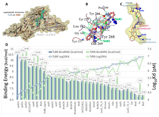 Docking of selected ligands to the SARS-CoV-2 NSP3 PLpro (PDB: 7LBR and 7JRN). Experimentally proven drugs investigated include PLpro inhibitors (i.e., XR8-89 [56]; GRL0617, Jun9-72-2, and Jun9-74-4 [14]). Upper panel, (A): The 7LBR PLpro domain X-ray crystallographic structure (blue ribbons) superimposed onto PLpro 7JRN (maroon ribbons). Overall RMSD for aligned structures = 0.478 Å. Approximate boundaries of the docking region, which contained the catalytic Cys11 residue, are indicated by the gray rectangle. The 2-phenylthiophene-based inhibitor “7LBRLignd” (XR8-89) [56] bound in the “BL2” groove proximal to the catalytic site is also indicated (cyan atoms). The 7LBR structure has been rendered as the Van der Waals surface (yellow shading). Upper panel, (B): Docked bisartan ACC519TT (dusty blue carbon atoms) superimposed on the docked PLpro inhibitor XR8-89 (maroon carbon atoms) for the 7LBR receptor. ACC519TT adopted a conformation along the BL2 groove that was similar to XR8-89 (molecule pair RMSD = 9.49 Å), with both ligands sharing a number of close contacts with 7LB6 residues, including Leu162, Tyr273, Tyr264, Pro299, Tyr268, and Gln269. Non-bond drug–receptor interactions included hydrophobic (green lines), pi–pi resonance (red lines), cation–pi (blue to light-blue lines), and hydrogen bonds (dashed yellow lines). Locations of the dual anionic tetrazole groups are labeled in blue as Tet#1 and Tet#2. Upper panel, (C): The bisartan tetrazole functionalities appeared bioisosteric with the terminal aminocyclobutane and cyclopentane groups of XR8-89. A similar relationship was observed for the central benzimidazole group of ACC519TT that overlapped the central benzene ring of XR8-89. Lower panel, (D): Docking results expressed as ligand binding energies in kcal/mol. Log10Kd values in pM units were computed from the binding energies [32]: color key: blue bars = docking to the PLpro domain of PDB 7LBR and green bars = docking to the PLpro domain of PDB 7JRN. Abbreviations: ACC519TT, benzimidazole bis-N,N′-biphenyltetrazole; ACC519T[1], benzimidazole-N-biphenyltetrazole; Azil, azilsartan; Bis, bisartan; Cande, candesartan; cpd, compound; DIZE, diminazene aceturate; Epro, eprosartan; Gln, glutamine; Gly, glycine; Irbe, irbesartan; Leu, leucine; Lo, losartan; Mac1, macrodomain-1; Met, methionine; Nirmat, nirmatrelvir; NSP3, non-structural protein 3; Olme, olmesartan; PLpro, papain-like protease; Pro, proline; RMSD, root-mean-standard deviation; RSV, respiratory syncytial virus; SARS-CoV-2, severe acute respiratory syndrome coronavirus 2; Tyr, tyrosine; XR8-89, 7:BR-Ligand; Å, Angstrom.