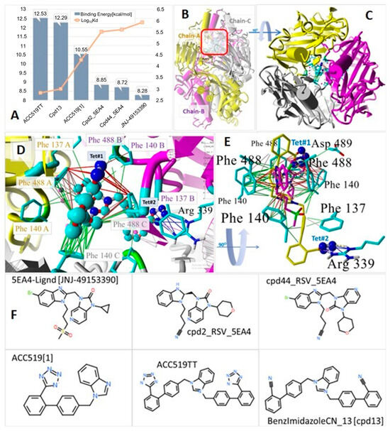 (A) Docking results of selected ligands targeting the RSV F-postfusion (i.e., drug-induced) protein that mediates virus entry into host cells. In its native (host-free) state, the homotrimeric F-protein exists in a metastable “prefusigenic or prefusion” conformation and must undergo a structural rearrangement that facilitates membrane fusion [61]. Ligands were docked into the three-fold symmetric domain (3FSD) of the virion F-protein (PDB 5EA4) located in the upper (surface) central cavity where the three chains intersect, denoted in the side-view projection by the red square in (B). Induced-fit binding of the potent RSV F-protein inhibitor JNJ-49153390 within the 3FSD interlocks two of the protomers in the pocket, effectively stabilizing the prefusion conformation and preventing host cell fusion and infection. Docking results indicated the bisartan ACC519TT bound significantly more strongly (12.53 kcal/mol) into the 3FSD pocket compared to all other drugs tested. The binding energy of JNJ-49153390 (8.28 kcal/mol), as well as those of two other structurally similar experimentally proven F-protein inhibitors (i.e., cpd2-5EA4 and cpd44-5EA4) were substantially lower. (C) Structure of 5EA4 with docked ACC519TT (in the drug-bound postfusogenic conformation) showing the three color-coded protomers (Key: yellow = Chain-A; magenta = Chain-B; gray = Chain-C) in the down-axis view rotated 90° from the side view in B. (D) Magnified down-axis view from C showing binding mechanism of ACC519TT involving a putative tethering of all three protomers by interactions with symmetrically arranged 5EA4 residues Phe488 and Phe140 (in each chain). Unlike the binding of JNJ-49153390, ACC519TT binding also involved strong electrostatic (salt bridge/pi–cation) interactions (blue lines) of the tetrazole#2 (Tet#2) functional group with a deeply buried Arg339 residue in Chain-B. The tetrazole#1 (Tet#1) group of ACC519TT was effectively coordinated by two of the symmetrically arranged phenylalanine residues (Phe488-A and Phe488-C) through pi–pi resonance bonding (red lines). This type of dual protomer binding by ACC519TT was similar to that reported by Battles and coworkers [61] regarding JNJ-49153390. Finally, additional hydrophobic interactions (green lines) between Phe140-C and one of the phenyl groups proximal to Tet#1 and adjacent to the central benzimidazole moiety also contributed to ACC519TT stability in the 3FSD pocket. (E) Side-view image rotated 90° from D showing docked ACC519TT (yellow C atoms) superimposed onto the X-ray crystallographic pose of the F-protein antagonist JNJ-41953390 (magenta C atoms). This view illustrates more clearly the interaction of Tet#2 with the buried Arg339 residue of Chain-B through ionic (blue lines) and hydrogen bonding (thick dashed yellow line). (F) Chemical structures of the six ligands evaluated. Chemical key: O. oxygen; S, sulfur; Br, bromine; N, nitrogen. Abbreviations: ACC519TT, benzimidazole bis-N,N′-biphenyltetrazole; ACC519T[1], benzimidazole-N-biphenyltetrazole; Asp, aspartic acid; Arg, arginine; cpd, compound; F-protein, fusion protein; PDB, Protein Data Bank; Phe, phenylalanine; RSV, respiratory syncytial virus; S, sulfur; Tet, tetrazole; JNJ49153390, 5EA4-Ligand; 3FSD, 3-fold-symmetric domain.