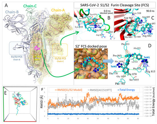 Binding of bisartan ACC519TT to the furin cleavage sites of the SARS-CoV-2 spike (S) protein. (A) Full-sequence homology model (Swiss Model 05) of the SARS-CoV-2 spike protein showing locations of the S’ and S1/S2 FCSs. The three homotrimeric chains are color coded: Chain-A = yellow with Van der Waals surface (yellow shading); Chain-B = green; Chain-C = blue. The model is rotated so that the S2′ FCS of Chain-A with docked bisartan ACC519TT (cyan carbon atoms) is shown located in the center of the model. (B) Docked pose of bisartan ACC519TT in the S1/S2 spike FCS consensus loop region showing the interaction of tetrazole#1 (Tet#1) with Arg685. (C) ACC519TT conformation following 90 ns of an NPT MD simulation at 311 °K, 0.9%wt/vol saline with periodic boundaries (see Methods) of an isolated model “fragment” of the S1/S2 FCS binding domain depicted in (E). Water and NaCl ions have been hidden for clarity. The four terminal fragment residues of the FCS model in (E) were capped and frozen during the MD simulation. Analysis of the MD trajectory indicated the total system energy was essentially equilibrated throughout the simulation (blue line in (F)). Despite the significant thermal motion of the FCS model (RMSD ranged from about 1 to 4 Å), the bisartan remained stably bound for the 90 ns duration of the MD simulation (drug RMSD ranged from about 1 to 5 Å). The comparison of the initial docked drug pose in (B) with that following the MD simulation (C) revealed that the bound ligand re-oriented, abandoning its initial Tet#1 interaction with Arg685 and establishing new stabilizing interactions with Arg residues 682 and 683 via ionic pi–cation bonding mechanisms (blue lines). Additional drug–receptor bond types included hydrophobic (green lines) and pi–pi (red lines) interactions. (D) Magnified view of the conformational pose of bisartan ACC519TT in the S2′ FCS pocket following VINA docking (see Methods). Details of the ligand–receptor interactions in the S2′ site are shown to the right (blue arrow). Color key: thin colored lines = primary intermolecular interactions; green = hydrophobic interactions; red = pi–pi; magenta = ionic; blue = pi–cation. Abbreviations: ACC519TT, benzimidazole bis-N,N′-biphenyltetrazole; Ala, alanine; Arg, arginine; Cys, cysteine; FCS, furin cleavage site; Ile, isoleucine; Gln, glutamine; Glu, glutamic acid; Gly, glycine; His, histidine; Leu, leucine; Lys, lysine; Phe, phenylalanine; Pro, proline; RMSD, root-mean-standard deviation; S, subunit; SARS-CoV-2, severe acute respiratory syndrome coronavirus 2; Ser, serine; Tet, tetrazole; Thr, threonine; Tyr, tyrosine.