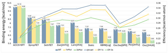 Furthermore, we conducted a comprehensive comparison of VINA binding energies and per-atom efficiencies for ten drugs against three distinct neuraminidase receptors (Figure 10). The ten drugs under scrutiny encompassed a diverse array of antivirals: (1) ACC519TT—an experimentally validated bisartan antiviral (Figure 1C, Figure 3F and Figure 5); (2) tripropyl-tetrazole—a theoretically proposed drug [68]; (3) triethyl-tetrazole—a theoretically proposed drug [69]; (4) zanamivir—an FDA-approved antiviral specifically targeting influenza neuraminidase [70]; (5) laninamivir—an FDA-approved antiviral specifically targeting influenza neuraminidase [71]; (6) sialic acid—the native substrate for neuraminidase [72]; (7) 6BR6[Lig]—an experimentally validated neuraminidase inhibitor extracted from PBD:6BR6 [73]; (8) oseltamivir-triazole—an experimentally validated neuraminidase inhibitor extracted from PDB:6HP0 [74,75] (9); peramivir—an FDA-approved antiviral specifically targeting influenza neuraminidase extracted from PDB:2HTU [76]; and (10) oseltamivir—an FDA-approved antiviral specifically targeting influenza neuraminidase extracted from PDB:2HU0 [55]. The neuraminidase receptors utilized in the study include the crystal structure of neuraminidase in complex with sialic acid (PDB:5L18), its single mutant 1xMut (R153A), and the triple mutant 3xMut (R153A-R294A-R372A). To establish these mutants, alanine substitutions were introduced at specific pocket loci deemed crucial based on a paper by Gubareva et al. [77].