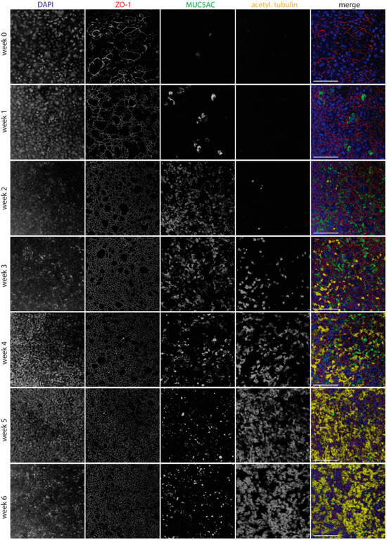 Epithelial integrity was further evaluated by measuring transepithelial electrical resistance (TEER), and it remained stable from week 2 of differentiation onwards (Figure 1D). Using laser scanning confocal microscopy, tight junctions were detected early after differentiation by staining with an antibody to ZO-1. Goblet cells, visualized by staining of MUC5AC, appeared after one week of differentiation and were most numerous at 2–4 weeks of differentiation. Cilia, stained by an anti-acetylated tubulin antibody, were visible starting from week 3 and were fully developed by week 5 (Figure 2).