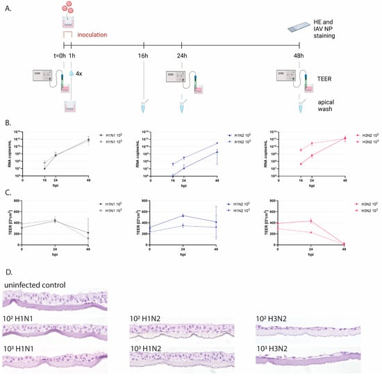 To functionally evaluate porcine WD-AECs, we employed inoculations with IAVsw as an infection model (Figure 3A and Supplementary Figure S1). WD-AECs of three different porcine donors were washed with PBS to remove mucus and subsequently inoculated with 10 µL of 102 or 103 TCID50 of H1N1, H1N2 or H3N2 strains for one hour. Apical washes collected at 16, 24 or 48 hpi were analyzed by qRT-PCR. For all three virus strains, an increase in viral RNA genome loads were observed over time. For H1N2, a dose–response relationship was maintained throughout the 48 h, while for H1N1 and H3N2, a dose-dependent difference in viral RNA copies was visible only at earlier time points (Figure 3B). TEER values remained stable for H1N2-inoculated WD-AECs, while for H3N2, TEER values reached almost zero after 48 h. TEER values for H1N1-inoculated WD-AECs declined over time (Figure 3C).