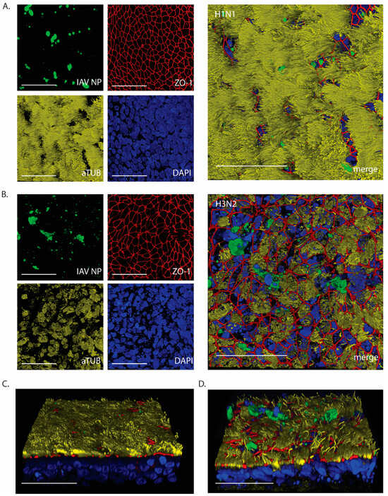 At 24 hpi, WD-AECs inoculated with 103 of H1N1 or H3N2 were evaluated by confocal laser scanning microscopy (Figure 4A and Figure 4B, respectively). While the epithelium composition remained comparable to that of intact WD-AECs inoculated with H1N1 (see Figure 2), striking cytopathogenic effects were observed in H3N2-inoculated WD-AECs. Tight junctions were discontinuous, cilia were shortened and less abundant, and there was an increase in karyorrhectic debris. At the same time, IAV-infected cells were visible in both cell layers, as shown by staining against viral NP. Interestingly, IAV NP-positive cells were often located apically within or slightly above the WD-AEC layer (Figure 4C,D).