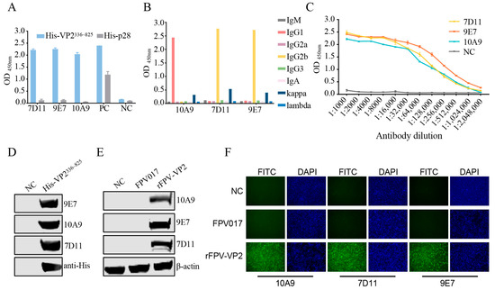 Screening and characterization of the mAbs. (A) Reactivity of the prepared mAbs with recombinant VP2336–825 protein was assessed using iELISA, with His-p28 protein as a specificity control. An anti-His antibody was used as a positive control (PC), and a serum from unimmunized mice was used as a negative control (NC). Each sample was tested in triplicate. (B) Isotype identification of prepared mAbs. (C) Antibody titers of the prepared mAbs were assessed using iELISA. A serum from an unimmunized mouse was used as an NC. Each sample was tested in triplicate. (D) Reactivity of the prepared mAbs with prokaryotic recombinant VP2336–825 protein was assessed with WB. The empty vector pET28a was used as an NC. (E,F) Reactivity of the prepared mAbs with eukaryotic VP2 protein was assessed with WB (E) and IFA (F). Uninfected cells served as the NC.