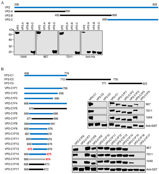 To evaluate the reactivity of the prepared mAbs with recombinant VP2 protein or the minimal epitope required for recognizing VP2, the corresponding protein samples were analyzed with WB. The experiments were conducted according to previously reported methods [32]. The anti-VP2 mAbs (hybridoma supernatant) served as the primary antibody for this project, and anti-GST and anti-His antibodies were utilized as positive controls, anti-mouse IgG-DyLight 800 (1:5000 dilution) was employed as the secondary antibody, and membranes were visualized using the LI-COR Odyssey Imagining System (LI-COR, Lincoln, NE, USA).