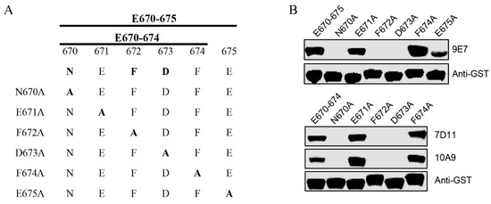 Alanine scanning to determine the key amino acids of E670–675 and E670–674. (A) This schematic illustrates the mutation strategy. (B) Six mutated GST-tagged E670–675 proteins (upper) and five mutated GST-tagged E670–674 proteins (lower) were expressed and tested for reactivity with the indicated mAbs using WB. GST-E670–675 and GST-E670–674 were used as positive controls. An anti-GST antibody was used to determine the loading dose of each sample.