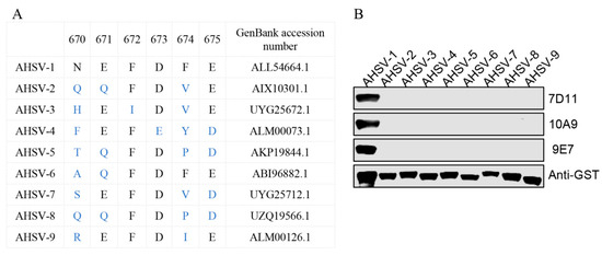 Conservative analysis of the epitopes. (A) This schematic illustrates the amino acid sequences of E670–675 (corresponding to AHSV−1 VP2) and the corresponding region in VP2 of AHSV−2 to 9. The black letters represent sites identical to the reference sequence (AHSV−1), while the blue letters indicate sites inconsistent with the reference sequence (AHSV−1). (B) The reactivity of a series of GST-fusion NEFDFE proteins containing the mutation site indicated in panel A was analyzed with 7D11, 10A9 and 9E7 using WB. An anti-GST antibody was used to determine the loading dose of each sample.