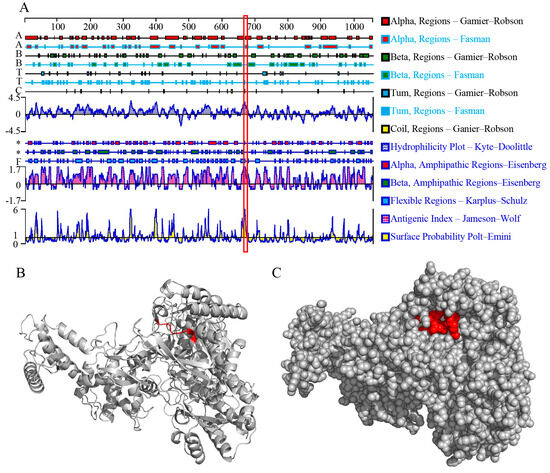 Structural analysis of the AHSV−1 VP2 protein. (A) The secondary structure and biological properties of antigenic epitopes of AHSV−1 VP2 proteins. (B,C) The spatial position of epitope E670−675 on the predicted 3D structure (cartoon model, B; sphere model, C) of AHSV−1 VP2.