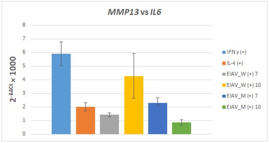 Furthermore, in this study, MMP13 represented a reliable target gene to evaluate the pro-inflammatory status of macrophages in horses as IFNγ and EIAV infection considerably increased its expression. In fact, MMP13 is related to a specific inflammatory condition [] but also is reported as being involved in infectious diseases such as bovine respiratory infection [].