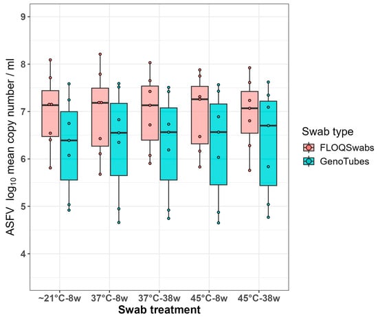 Boxplots comparing the effect of five different temperature and storage time treatments on the ASFV log10 copy number per mL for the two swab types, FLOQSwabs and GenoTube. Each point on the plot corresponds to the average copy number of three technical replicates.
