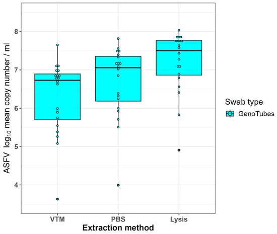 Boxplots comparing the ASFV log10 copy number per mL for the three different methods of extracting DNA from GenoTube swabs. Each point on the plot corresponds to the average copy number of three technical replicates.