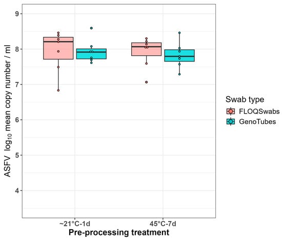 Assessing the impact on the ASFV log10 copy number/mL extracted from the swabs with a 7-day delay at a storage temperature of 45 °C as compared to a 1-day delay at room temperature storage; irrespective of swab type, the overall combined medians were 7.98 and 7.94 log10 copy numbers/mL, respectively (Table A3, Figure 3). Comparing the two swab types, the median log10 copy number/mL extracted from the FLOQSwabs was slightly higher than that extracted from the GenoTubes (8.10 vs. 7.86), but this was not statistically significant (p = 0.787).