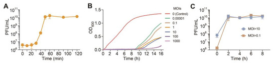 Overnight, wild-type MPAO1 culture was diluted 1000 folds, and mixed with PaTJ phages at various MOIs (1000, 100, 10, 1, 0.1, and 0.00001). Then, the mixtures were seeded in 96-well plates with 200 μL per well. The plates were cultured at 37 °C and cell turbidity was measured each minute till 16 h. The growth of MPAO1 cells without adding phages (MOI = 0) was used as a control.