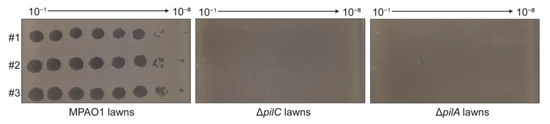 PaTJ uses T4P as its receptor. The PaTJ phages were serially diluted by a factor of 10 and were plated onto lawns of the wild-type MPAO1 strain as well as two T4P mutant strains, ΔpilC and ΔpilA, respectively. Three independent phage samples were utilized and were designated as #1, #2, and #3.