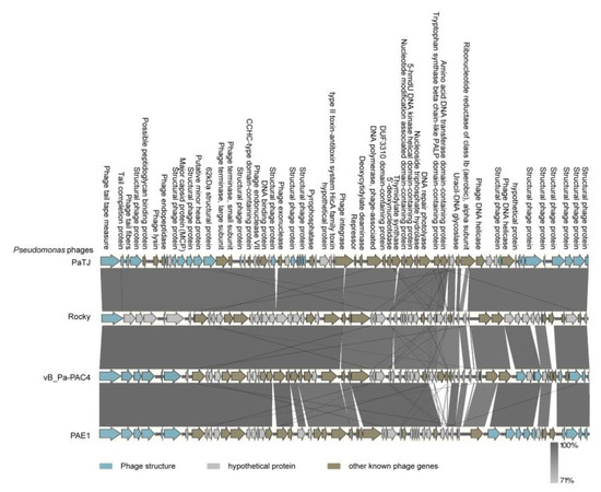 Comparative genome analysis of the P. aeruginosa phages PaTJ, Rocky, vB-Pa-PAC4, and PAE1.