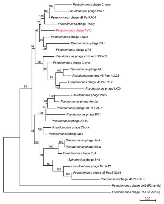 Firstly, 22 homologous phage genomes of PaTJ phages were retrieved from the NCBI Virus database (https://www.ncbi.nlm.nih.gov/labs/virus/vssi/#/, accessed on 15 August 2024). In addition, 2 outgroups including P. aeruginosa phage phi3 (P2 familay) and P. aeruginosa phage Pa-O (PAcq-4) were collected. Whole genome sequences were subjected to MUSCLE alignment using MEGA11, and the tree was constructed using the neighbor-joining method.