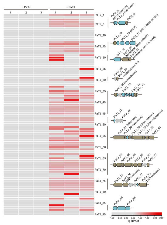 During infection, the expression pattern of PaTJ phage-encoding genes undergoes dynamic changes. To identify the early-expressed genes in the latent stage, transcriptome analysis was conducted on MPAO1 cells infected within the PaTJ phage (MOI = 0.01) for 30 min or not. In this stage, those genes involved in DNA replication (DNA primase and DNA polymerase), recombination (integrase), and repair (helicases) become highly expressed to enable the phage to hijack the host’s cellular machinery for its own replication (Figure 6). In addition, those genes encoding structural proteins (major capsid protein, tail fiber-related proteins, and other diverse structural phage proteins), packaging (terminase), and nucleases (endonuclease VII and exonuclease), are activated to facilitate the assembly of progeny phages and the eventual lysis and release of new viral particles. The majority of these genes are expressed in several clusters, suggesting the possibility that phage genes may share promoters to ensure coordinated regulation and efficient expression of functionally related genetic elements. In addition, 26 genes encoding lysin, holin, HicA toxin, endopeptidase, minor tail protein, diverse structural proteins, and several hypothetical proteins were not expressed at this stage and they may be genes expressed at late infection stages responsible for host lysis and the final assembly of phage particles inside the cells. This orchestrated pattern of gene expression ensures the efficient propagation of the phage within the host environment.