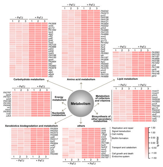 The impact of PaTJ infection on expression of host genes. Normalized expression of MPAO1 genes in samples in Figure 6 was also analyzed. Only KEGG pathways related to metabolism were significantly enriched and the expression levels (lgRPKM) of genes in enriched pathways were depicted in heatmaps. Three independent cultures were used for both groups.