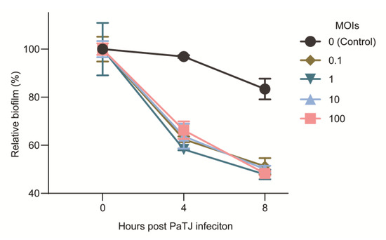 P. aeruginosa is known to form biofilms in vivo and in vitro, one of the most important virulence determinants and survival in a hypoxic atmosphere or other extremely harsh environments [26,37,38,39]. To assess the biofilm degradation potential of the PaTJ phage against pre-established biofilms, MPAO1 cells were allowed to form attached biofilm for 24 h, after which the PaTJ phage introduced a serial of initial MOIs of ranging from 0 to 100 to establish a phage–bacterial co-culture system. As shown in Figure 8, a significant loss of biomass was observed in all MOI groups except the control group without adding any phages, with approximately 50% biomass observed after 8 h of incubation even at a low MOI of 0.1. This suggests that PaTJ has a strong potential to the degradation of biofilm structure which may be related to its lysis of cells on the periphery of the biofilm, further penetrating bacterial biofilms to infect inner bacteria, resulting in in lysis.