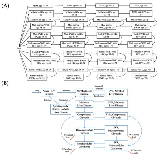 We adapted a previously developed dynamic, deterministic compartmental model of HCV transmission and disease progression among adults in the COSD [7]. The model simulates the entire adult population of the COSD, stratified by transmission risk (the model previously included people who inject drugs (PWID) and men who have sex with men (MSM) as it was focused only on transmission and was subsequently extended to incorporate former or never PWID (ex/non PWID) to track disease burden in the entire population). The model is open, with individuals entering at age 18 into one of the population groups (MSM, PWID, ex/non-PWID) and leaving the model due to age-specific mortality. Additionally, PWID can permanently cease injecting and move into the ex/non-PWID compartments. Each group is also stratified by age (18–39, 40–54, 55–74, and 75+), gender (male/female), HIV status (susceptible, infected) (Figure 1A), and HCV disease stage (Figure 1B). The hepatitis C infection and disease stages are: (i) susceptible, (ii) spontaneous clearance from no/mild liver disease, (iii) sustained viral response (SVR) from no/mild liver disease (iv) susceptible moderate liver disease, (v) susceptible compensated cirrhosis, (vi) susceptible decompensated cirrhosis, (vii) susceptible hepatocellular carcinoma, (viii) no/mild liver disease, (ix) moderate liver disease, (x) compensated cirrhosis, (xi) decompensated cirrhosis, and (xii) hepatocellular carcinoma. We assume HIV status is a fixed characteristic; the model does not simulate HIV transmission dynamically due to the stable HIV prevalence among PWID and MSM in the COSD [8,9].