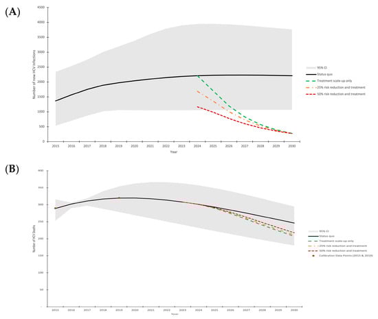 We used a two-step calibration process for the model. First, we used a simplified submodel (simulating PWID and MSM only, neglecting ex/non-PWID) to determine transmission and treatment-related parameters for these groups. This allowed us to seed the epidemic in 1955 and run the model to achieve equilibrium prior to the recent scale-up of treatment and changes in transmission risk. Then, we inputted these calibrated transmission and treatment parameters into the full model (simulating all risk groups), which was initialized in 2015 based on our recent burden estimation (for non-PWID) and outputs from the submodel (for PWID and MSM). Using this full model, we then ran a secondary calibration to determine HCV-related mortality parameters based on recent mortality trends. The final calibrated model thus was consistent with epidemiological data on both HCV prevalence and mortality. Details of the full model and the submodel used for calibration are found in the Supplementary Materials. Therefore, the final full model was calibrated to data on HCV seroprevalence in 2015 among MSM (4.6% among all MSM, 16.5% among MSM with HIV) [5,22]; HCV viremia prevalence among HCV seropositive people coinfected with HIV of 42.1% (2010), 18.5% (2018), and 8.5% (2021) [19]; the number of PWID in 2007 [5,20]; HCV seroprevalence of 46% and 36% among young PWID (aged 18–39) and older PWID (aged 40–74) in 2021, respectively [13]; primary HCV incidence rate among PWID of 17.14 per 100 person-years in 2021 [13]; and total HCV-related deaths in 2015 (290) and 2019 (320) [21]. Calibration was obtained by varying the following parameters: transmission rate among MSM, transmission rate among PWID, degree of assortative mixing among MSM by HIV status, annual treatment rates among HIV/HCV co-infected individuals (1996–2010, 2011–2017, and 2018–2021), the relative risk of transmission among young PWID (aged 18–39), start year of increased risk among young PWID, HCV-related death rate scaling factor, and the proportion of HCV Ab+ non-PWID with previous successful treatment in 2015.