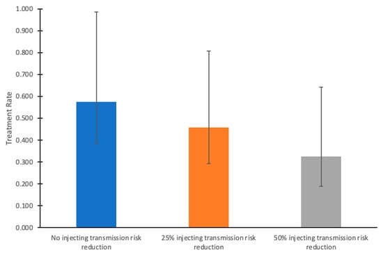 Annual HCV treatment rates required to achieve the HCV incidence elimination goal by 2030 among HCV-infected people without HIV, given varying levels of injecting transmission risk reduction from 2024 onward in the COSD. In these scenarios, HCV treatment rates among people coinfected with HCV and HIV remain at their baseline (65%/year). Bars indicate mean values, and whiskers denote the lower (2.5th percentile) and upper (97.5th percentile) bounds from the simulations.