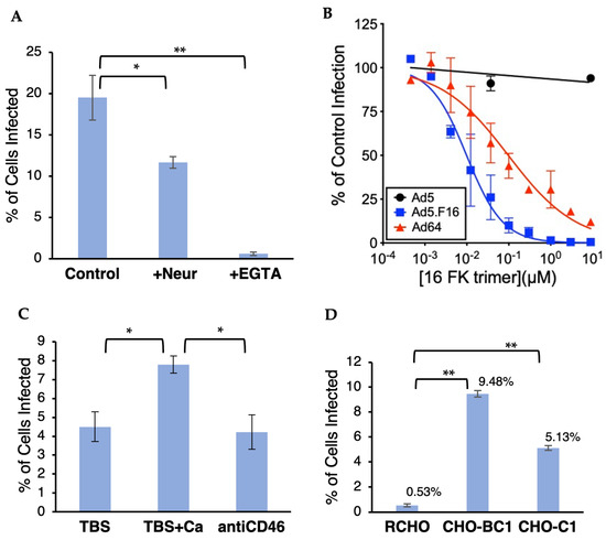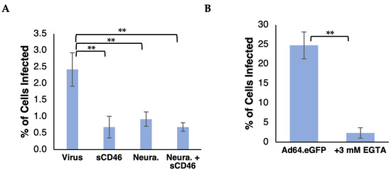 Because HAdV-D64 and HAdV-D37 have identical fiber proteins and similar disease tropism, we hypothesized that HAdV-D64 would use the same receptors, CD46 and sialic acid, as HAdV-D37. It was previously shown that HAdV-D37 interaction with Chang conjunctival cells and with CD46 is dependent on the presence of divalent calcium ions [32]. Chang conjunctival cells had been used in studies [14,18,32] of HAdV-D37 interactions with its receptors but were shown to be contaminated with HeLa cervical carcinoma cells, which may have mixed its genome with or overgrown the conjunctival cells (https://www.atcc.org/products/ccl-20.2, accessed on 19 June 2024; [33]). Due to the uncertainty of the origin of Chang conjunctival cells, we chose to directly test HeLa cells, which we used to represent cells in the genitourinary tract targeted by HAdV-D64 and D37. To determine if Ad64 uses CD46 and/or sialic acid as receptors for entry into HeLa cells, we treated the cells with either 10 mM ethylene glycol-bis(β-aminoethyl ether)-N,N,N′,N′-tetraacetic acid (EGTA), which preferentially chelates and sequesters calcium(II) ions, or 10 mU neuraminidase from Vibrio cholerae, which enzymatically removes cell surface sialic acid sugars. We infected treated cells with an E3-deleted adenovirus type 64 containing the enhanced green fluorescent protein (eGFP) gene driven by a cytomegalovirus promoter (Ad64.eGFP) and then assessed eGFP gene delivery using flow cytometry. Neuraminidase and EGTA treatment both significantly decreased Ad64.eGFP entry (Figure 1A), indicating that HAdV-D64 entry, like HAdV-D37 entry, is dependent on the presence of sialic acid and/or calcium. Cleaving sialic acid off the HeLa cell surfaces decreased Ad64 entry by ~40%, whereas chelating calcium decreased viral gene delivery by ~97%, suggesting that viral entry is only partially dependent on sialic acid, but almost entirely dependent on the presence of calcium.