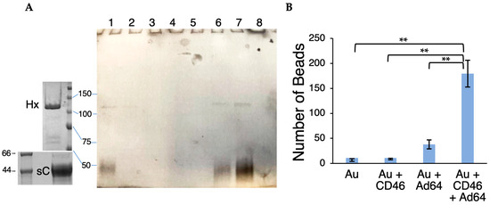 Direct binding of HAdV-D64 to soluble CD46. (A) Ad64.eGFP particles were co-precipitated with His-tagged soluble CD46 (sC) using Ni-NTA Agarose then subject to SDS-PAGE. Main panel lanes: 1, CD46 (~45–50 kDa) mixed with Ad64.eGFP; 2, flowthrough from NiNTA Agarose, 3–5 wash fractions, 6–8 elution fractions. Hx, HAdV-D64 hexon. Gel images of ultracentrifugation-purified Ad64.eGFP (top left) and purified sCD46-C (bottom left) are shown to the left for comparison. Masses of molecular standards are shown in kDa. (B) 5 nm Ni-NTA-NanoGold beads (Au) were incubated with CD46, Ad64.eGFP particles, or both, filtered through a 0.1 µm filter, visualized using transmission electron microscopy at 60,000× magnification, and counted. Only the presence of the large adenovirus particle and CD46 led to substantial retention of NanoGold beads in the filter (ANOVA-T, n = 3 for each treatment). Double asterisks, p < 0.0001.