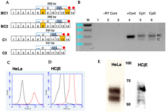 RNA was extracted from approximately 106 HCjE cells using 1 mL of Trizol (ThermoFisher) reagent according to the manufacturer’s protocols. The first strand of cDNA was synthesized by mixing 4 µL SuperScript VILO Mastermix containing random primers (Invitrogen, Waltham, MA, USA) with 12 µL water, then 4 µL Trizol-extracted RNA. The mixture was incubated at 25 °C for 10 min, then 42 °C for 60 min, then 85 °C for 5 min to terminate the reaction. The cDNA was amplified with the following primers (based on [31]): PPIB_fw—TGTGGTGTTTGGCAAAGT, PPIB_rev—TGGAATGTGAGGGGAGTG, CD46_exon6_fw—TGACAGTAACAGTACTTGGGA, CD46_exon1213_rev—ATCAGTTAGGTATGTGCCTTTC, CD46_exon1214_rev—ACCATCTGCTTTCCCTTTC. The PPIB_fw and PPIB_rev pair amplified constitutively expressed PPIB. CD46_exon_6_fw forward primer binds exon 6 of CD46 for all the isoforms. The presence or omission of exon 13 dictates the tail type. CD46_exon_1213_rev amplified tail 1 isoform. CD46_exon_1214_rev amplified tail 2 isoform. Exon 8 encodes the 15 amino acid domain B of isoform BC, while omission of this exon corresponds to the C isoform. The products were amplified using Phusion High Fidelity PCR Master Mix with HF buffer (New England Biolabs, Ipswich, MA, USA) by 30 cycles of 98 °C for 10 s, 55 °C for 30 s, and 72 °C for 30 s following an initial 98 °C for 30 s step, then separated using 1.5% agarose gel electrophoresis.
